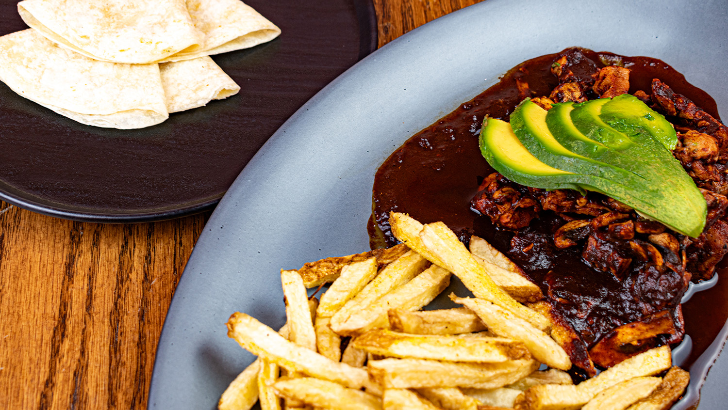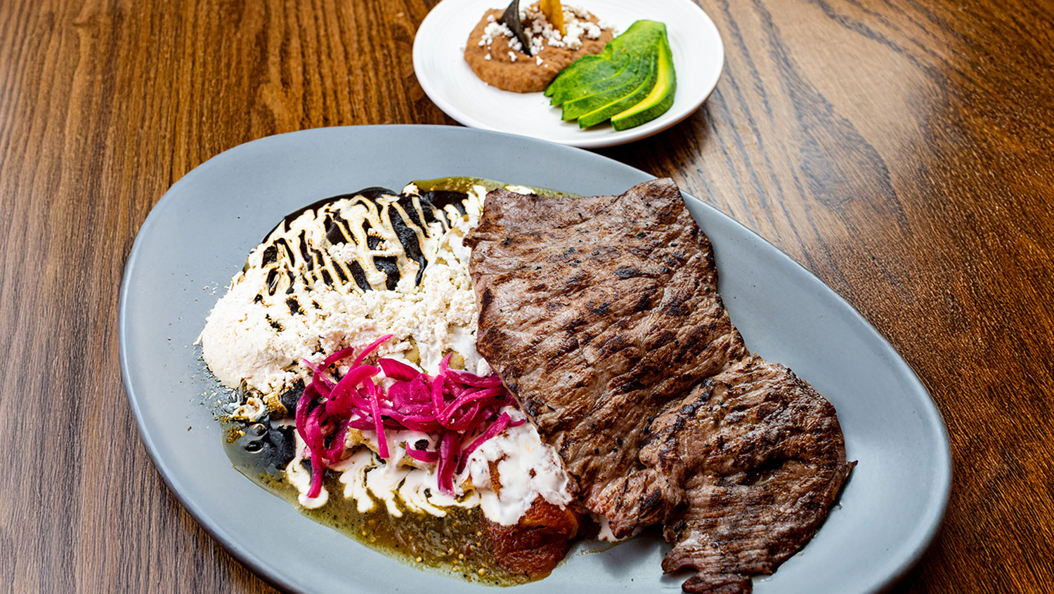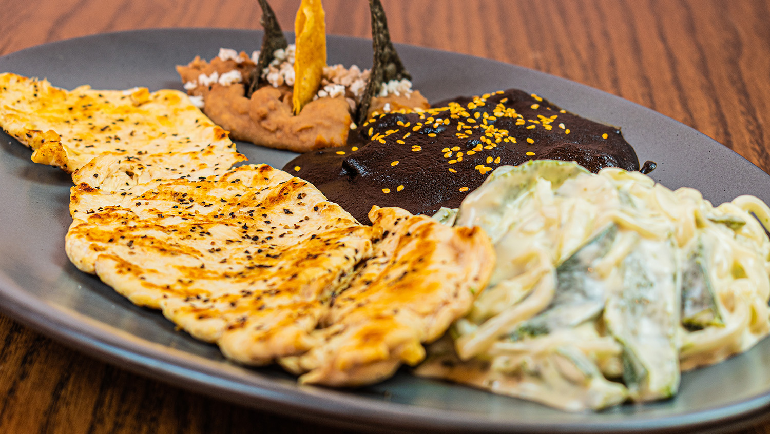 Jugosa pechuga de pollo, acompañada de dos enmoladas negras, rajas poblanas a la crema y … Leer más