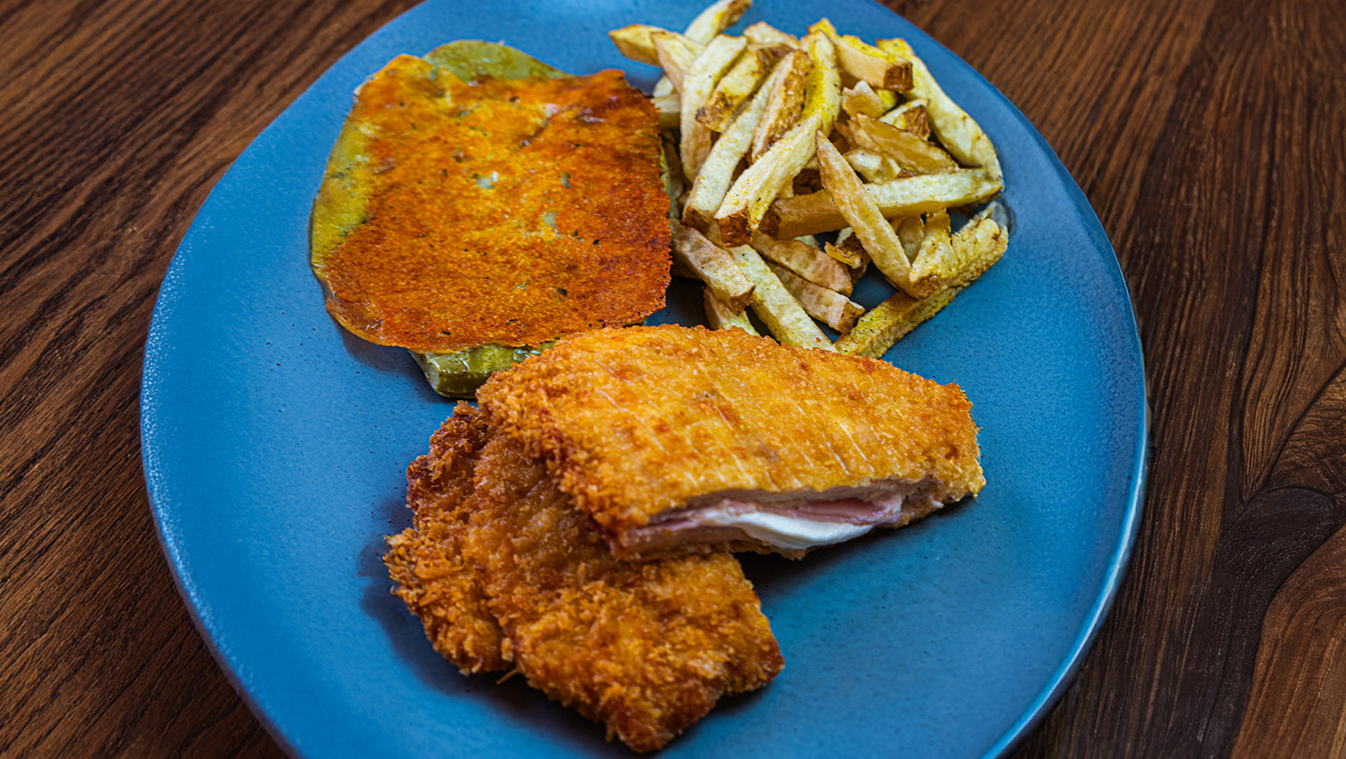 Pechuga empanizada con jamón, piña y queso manchego, servida con papas a la francesa caseras.