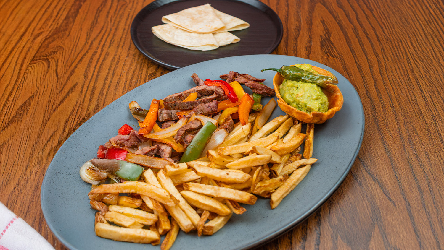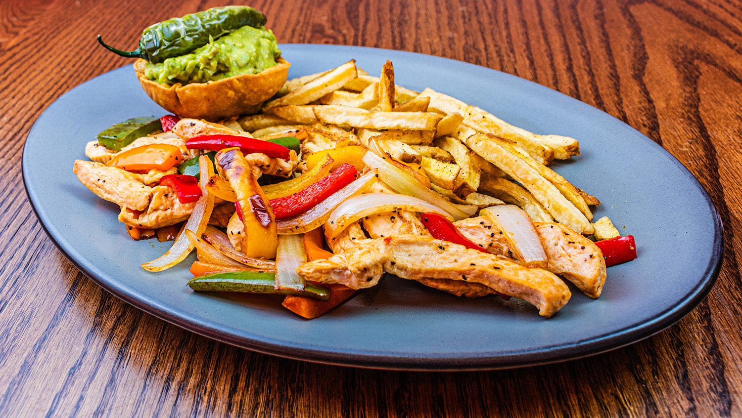 Pechuga de pollo asada con pimientos y cebolla. Servida con guacamole, papas a la francesa … Leer más