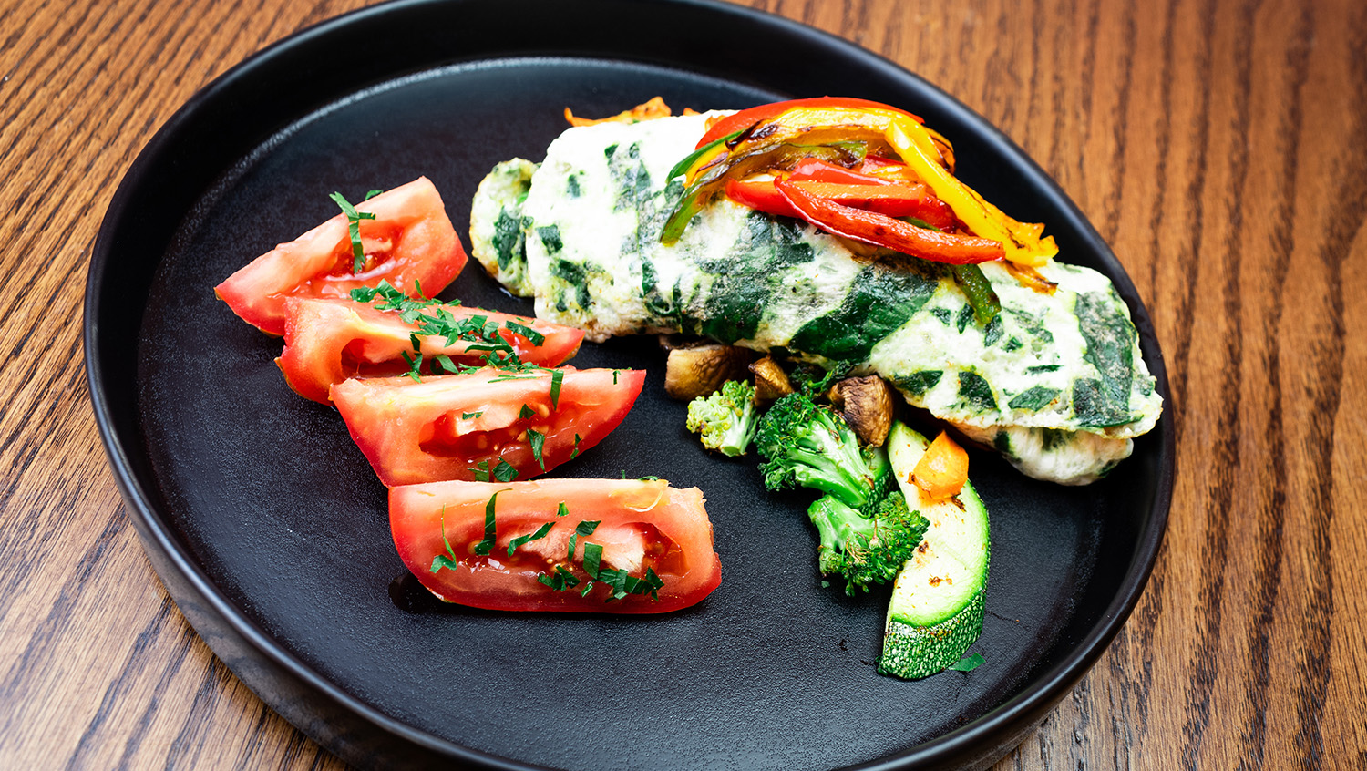 Cuatro claras, por dentro pimientos, espinaca y queso crema. Servido con verduras asadas y jitomate … Leer más